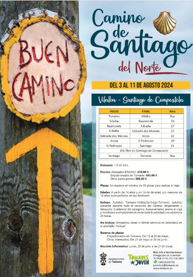 ¿Tienes la asignatura pendiente de hacer el Camino de Santiago? Este año, tienes una nueva oportunidad de hacerlo en verano con el Ayuntamiento de Tomares, este año por la Ruta del Norte, del 3 al 11 de agosto, desde Vilalba hasta Santiago de Compostela. Una experiencia que no olvidará.