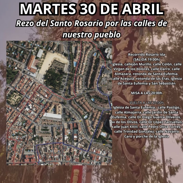 El rezo del Santo Rosario acompañando al Simpecado del Rocío por las calles de Tomares será este martes, 30 de abril. Saldrá a las 19 horas, de la Parroquia Ntra. Sra. de Belén. Por primera vez, visitará la Parroquia de Santa Eufemia y San Sebastián, donde presidirá la eucaristía a las 20 horas. A las 21 horas, volverá a su templo, acompañado por los cánticos del Coro Rociero de Tomares.
